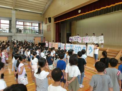 続いて、代表委員会からの学芸発表会スローガンの発表、6年生の笹の子スピーチ、最後に看護当番から今週の生活目標「よいことをすすんでやろう!」についての話がありました。