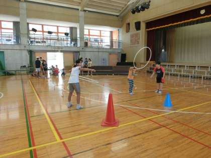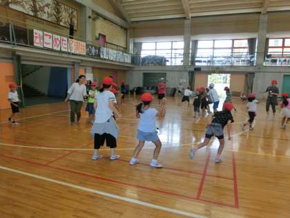 体育館では、障害物リレーやドロケイなどの遊びやゲームを楽しんでいました。