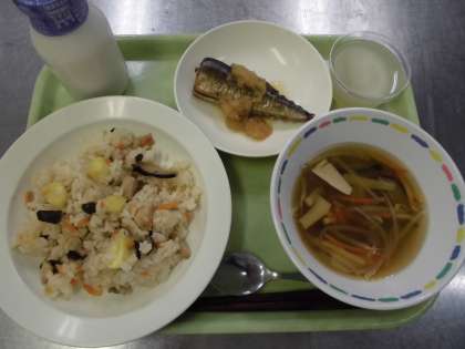 今日の魚の塩焼きは、秋の味覚の代表格、さんまです。さんまは漢字で、秋(あき)・刀(かたな)・魚(さかな)と書きます。秋が旬で、体のかたちが刀のように細長く鋭い魚であることから、このような漢字があてられました。