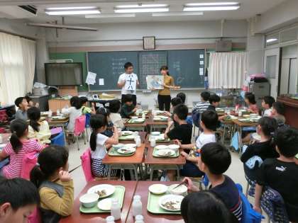 今日の給食の時間、市川栄養士が2年2組と1組を順番に訪問し、“給食時間における食に関する指導(5分間指導)”を行いました。
