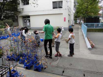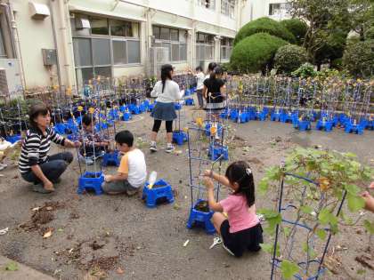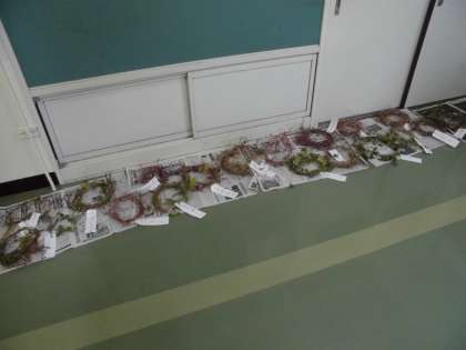 一年生が、育てた朝顔の種をとった後、抜いた朝顔の蔓を使ってリースを作っていました。きれいに丸くできたことを、嬉しそうに担任の先生に報告していました。