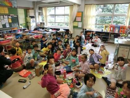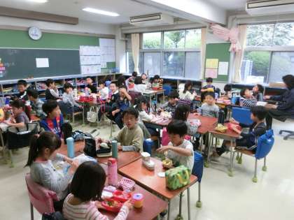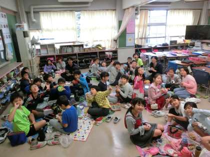 給食の時間、それぞれの教室でお弁当を開く子どもたちの表情には笑顔があふれ、とても楽しそうでした。普段とは違ったひとときとなり、これも貴重な思い出となったことと思います。延期実施日には、晴れて遠足に出かけられることを楽しみにしている子どもたちです。