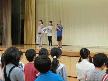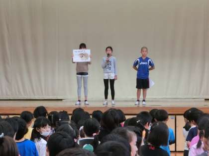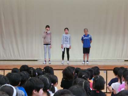 また、明日、6年生のみなさんが参加する世田谷区立小学校「連合運動会Aグループ」について紹介し、1年生から5年生までのみなさんが6年生へ、「頑張ってください!」の気持ちを込めて大きな拍手を送りました。出場種目は「個人種目の100m走・50mハードル走・走り幅跳び・走り高跳び、団体種目の400mリレー、学級対抗の長縄跳び」です。“6年生のみなさん、明日は全力で頑張ってください!”