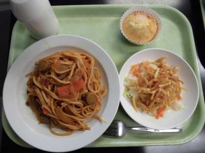 ナポリタンのナポリとは、イタリアの都市名のことですが、ナポリタンは実は日本生まれなんです。イタリア料理であるパスタを、日本人好みの味にしたもので、昭和以前から喫茶店や洋食屋さんでよく食べられていました。今でもお店や家庭ではもちろんのこと、お弁当のおかずとしても大人気の料理です。今日はデザートに珍しいケーキもあります。ぜひたくさん食べてください。