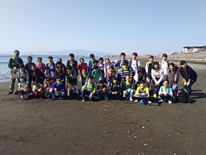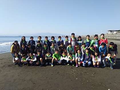 新江ノ島水族館正面の片瀬西浜で学級写真を撮影しました。