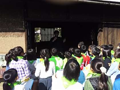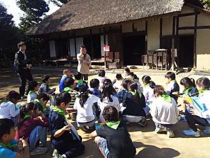 昔の民家や人々の暮らしなどについて、担当の方々から説明を受け、メモをしながら聞き入っています。また、質問をして学習しています。