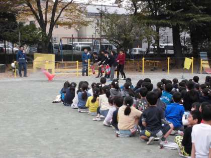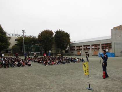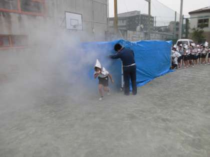 第1次避難場所に避難した後、区の防災担当の方よりお話をいただきました。その後教員による初期消火訓練(水入り消火器使用)を見学し、全学年の子どもたちが煙体験をしました。