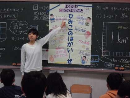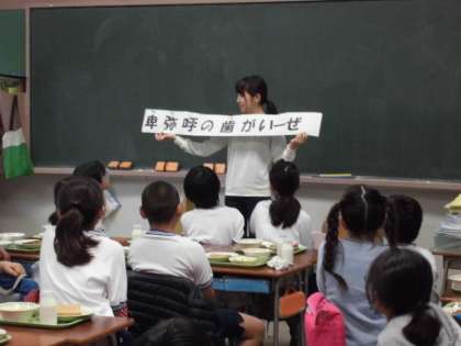 4年生の子どもたちに向けて、よく噛んで食べることのよさを「卑弥呼の歯がいーぜ」の言葉にのせて話しました。