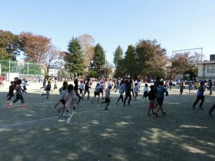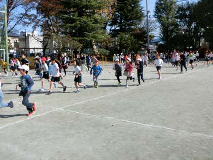 陽射しが差し込み、気温も少し上がり、中休みの校庭では、音楽が流れる中、みんなで各学年で決められたコースを元気よく走りました。