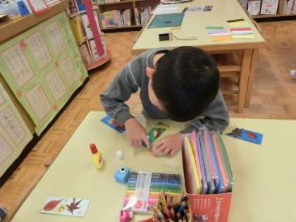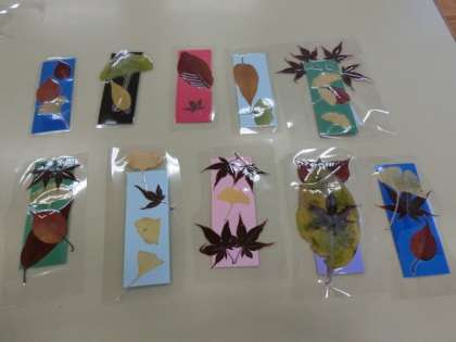 11月25日の土曜日に、図書館イベント「落ち葉のしおりをつくろう」が行われました。10時から小一時間で素敵なしおりがたくさんできていました。