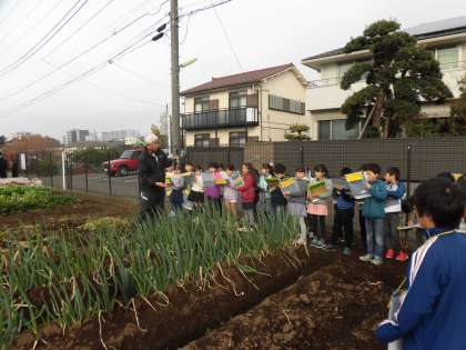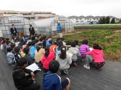 社会科の「農家のしごと」の学習で、河原農園に行きました。農園で育てている作物を見学したり、「いつ、どんな野菜を育てているのか」「育てた野菜は、どのようにしてお店に並ぶのか」「どんな思いをもって仕事をしているか」など質問をしたりしました。