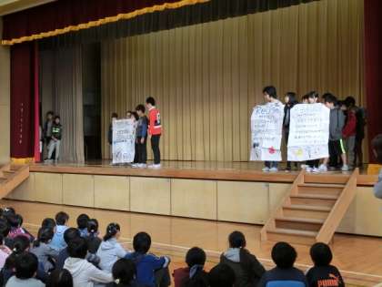 それぞれどういうことをすることなのかについて寸劇とともに紹介がありました。その後、クイズ形式で、このことは3つのRの何に当たるのかが出題されました。リサイクルについては正解が多かったです。