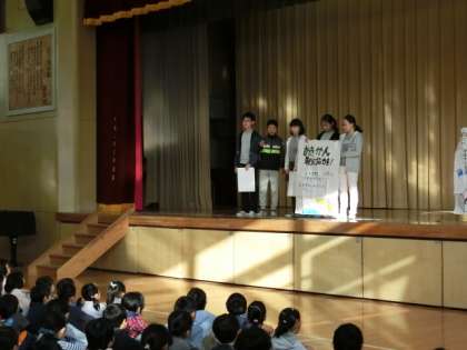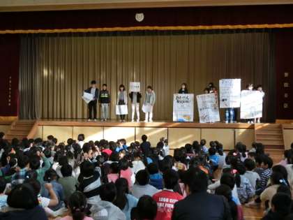 今日の集会は、エコグリーン委員会による、3R(リデュース、リユース、リサイクルの頭文字をとったもの)についての発表でした。