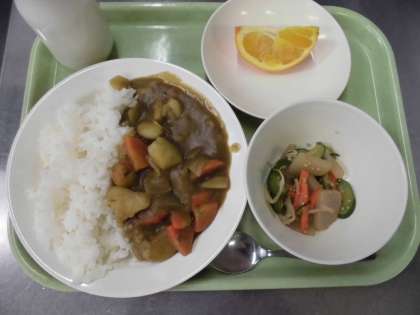 月に1度は登場するカレーは、いつも大人気のメニューです。毎回少しずつ違うカレーが出ていますが、今日はどんなカレーでしょうか?カレーの中の具をよく見てください。今日はえびやいかなど海でとれるものを使ったシーフードカレーです。お肉よりもえびやいかは好き嫌いが分かれる食品ですが、カレーパワーで今日もたくさん食べてください。食缶が空になって返ってくることを楽しみにしています。