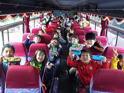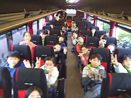 真冬並みの寒さのため、バスの中でお弁当を食べました。おいしいお弁当に、笑顔いっぱいの子どもたちです。