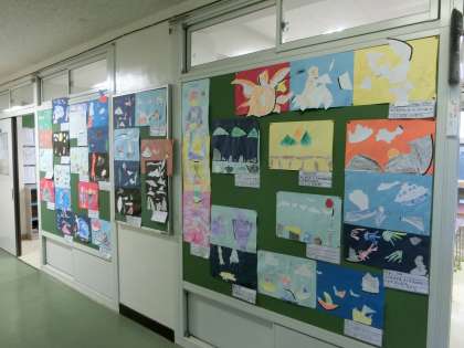 2年生の各教室の廊下掲示スコーナーには、2学期の図工の学習で製作した作品「たまごから生まれたよ」が展示されています。