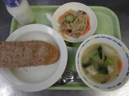 ごまあげパン、牛乳、ワンタンスープ、春雨サラダ