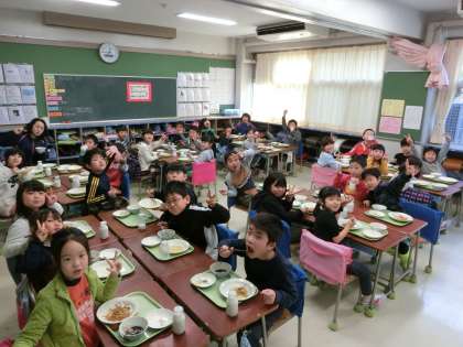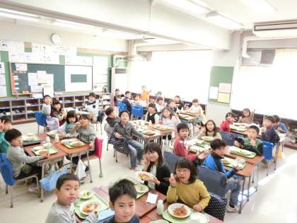 2年生の教室では、皿うどん・野菜のゆかりかけ・牛乳とともに、白玉しるこをおいしくいただき、笑顔あふれる子どもたちの表情がたくさん見られました。