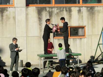笹原小サッカークラブ(サッカー)、船橋フェニックス(野球)、桜丘チェリーズ(バスケットボール)チームがそれぞれ校長先生から賞状や、カップ、メダル、盾などを受け取りました。これからも頑張ってください。