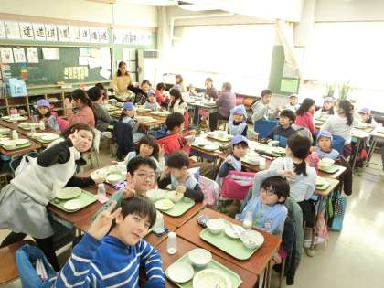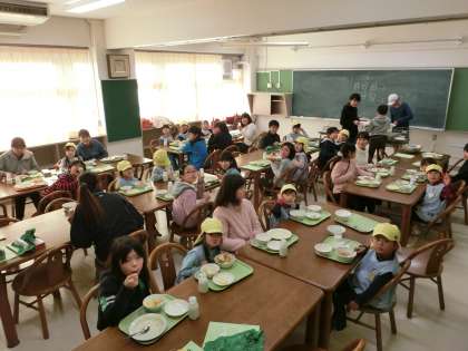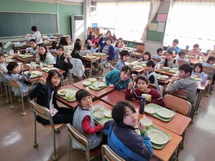 給食の時間、4つの教室に分かれて一緒に給食を食べました。