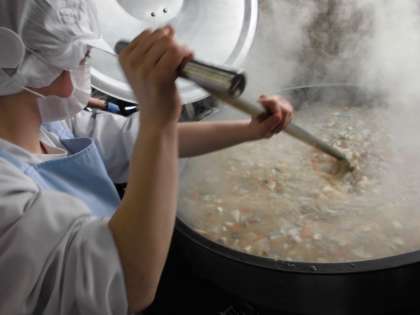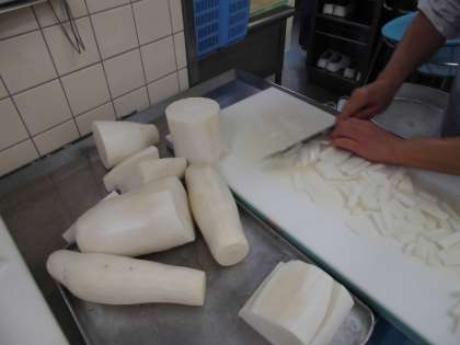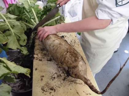昨日、目の教室の子どもたちが抜いてきてくれた大根を、今日の給食の豚汁、即席漬け、菜めしに使用しました。抜いてきた大根は驚くほど太く大きいものでした。普通の大根に比べてみずみずしく甘いので、さっと火を通すだけでとても食感がよくおいしくできあがりました。