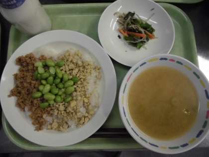 三色丼は、名前の通りごはんの上に三色の具材がのっています。肉そぼろの茶色、たまごそぼろの黄色、枝豆の緑色です。料理のなかにさまざまな色があると、見た目が良いだけでなく、それだけたくさんの種類の食材を食べていることになるので栄養バランスも良くなります。三色丼にする食材は、鮭だったり、青菜だったり、いんげんだったりします。三色丼はお弁当にも向いているので、将来みなさんがお弁当をつくろ機会がありましたら、その季節の食材を使用してきれいな色合いのお弁当を作ってみてください。