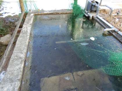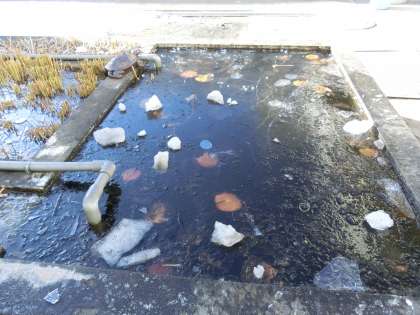 本日の寒さで職員室前の池に氷が張りました。昨日も凍っていましたが、今日は昨日よりも厚い氷で、1cmほどの厚みがありました。子どもたちが割ろうと試みていましたが、なかなか割れないほどの厚みでした。