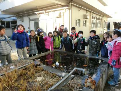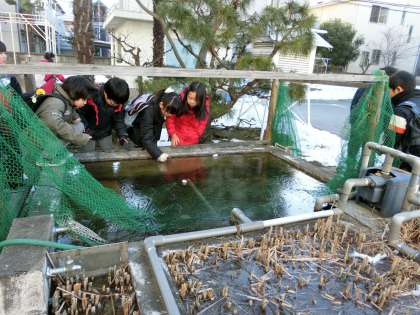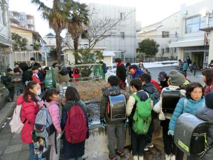 登校してきた子どもたち、特に南校舎東昇降口を利用する4年生と5年生には、中庭の池の凍結に注目が集まっていました。口々に「すごいよ! いつもより厚さが厚いよ!」などと、触れてみたり、叩いてみたりと、歓声が響いていました。自然の力強さを感じていた子どもたちの“大発見”です!