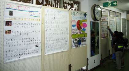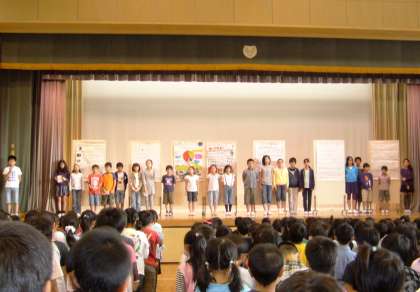 ユニセフ募金について10月18日の朝会で説明を行い、19日から募金を始めます。パネルを使って詳しく説明を行っている間、皆、真剣に聞いていました。パネルは、今、1・3年生の昇降口前に掲示しています。