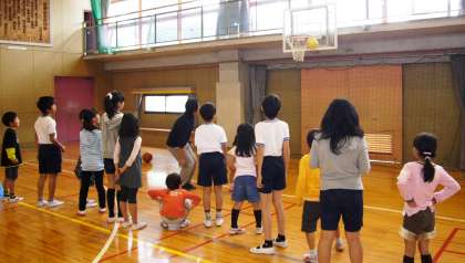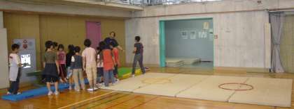 おんぶして10数える、バスケットゴールを使ったボールゲーム、フラフープでゲームの様子です。