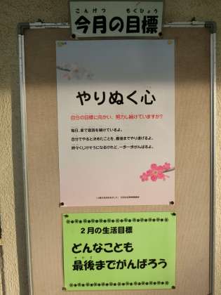 2月の人格の完成をめざしてのテーマは「やりぬく心」です。生活指導目標「どんなことも 最後まで がんばろう!」と関連させて取り組みます。