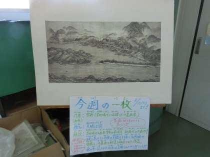 図工室入口で紹介されている“今週の1枚”は、今回は室町時代に活躍した水墨画家「雪舟」です。作品の解説がされていて、子どもたちも作品と歴史を結び付けながら鑑賞しています。