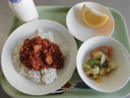 今日は2月9日の語呂合わせで「肉の日」と言われることがあります。今日のチリビーンズにも豚肉が入っていますが、もうひとつ、別の肉が入っています。みなさんわかりますか?それは「大豆」です。大豆は「畑の肉」と言われます。豚肉や鶏肉などは動物性のたんぱく質が豊富ですが、豆腐は植物性の食品でありながら、たんぱく質がとても豊富なので畑の肉と例えられるのです。たんぱく質は筋肉を作る材料になるだけでなく、骨や血や髪の毛など全身の成長に必要不可欠です。普通の肉も畑の肉も、積極的に食べるようにしましょう。