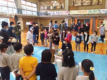 1年生から学年・学級の割り当て時間で、子どもたちのもちつきが始まりました。