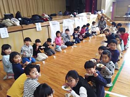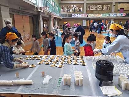 初めての参加となる1年生。杵の持ち方とつき方を教えていただき、一人5回ずつついています。学級全員が終わったところから、お餅をいただいています。「とってもおいしい!」と笑顔いっぱいの子どもたちです。