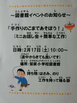 2月の図書館イベントでは、「手作りのこまであそぼう!」をテーマに、図書館司書によるミニお話会と簡単な工作を行う予定です。