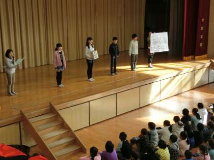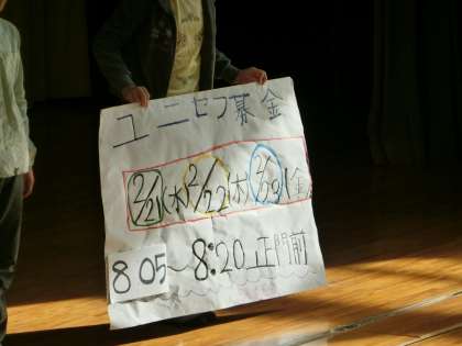 ユニセフ募金の目的や方法について説明があり、“世界の恵まれない子どもたちのために、募金に協力をお願いします!”との呼びかけに、全校から大きな拍手がありました。
