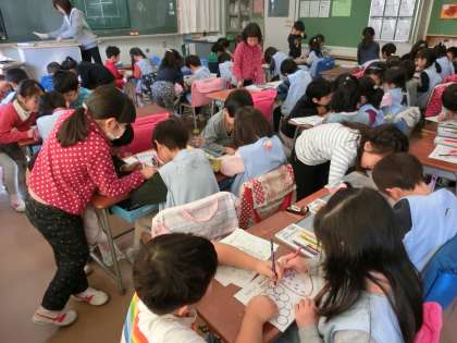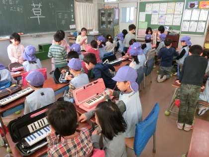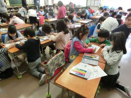 いっしょに絵に色を塗ったり、鍵盤ハーモニカをしょうかいしたりします。