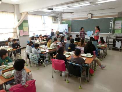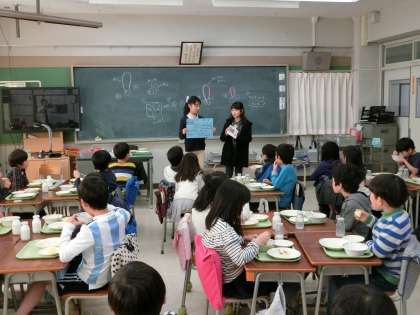 先週の集会では全校へ向けて、募金活動の趣旨や方法を伝えましたが、昨日と今日の給食の時間には各教室を訪れ、募金活動への協力のお願いと募金方法について説明を行いました。「ご協力をお願いします!」との呼びかけに、大きな拍手が送られていました。