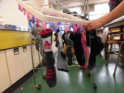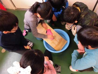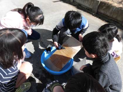 2月7日(水)と22日(木)に洗濯板やたらいを使って靴下を洗いました。子どもたちは「寒い中、冷たい水を使うのは大変だった。」「家族の分も洗うのは疲れるし時間がかかる。」「今はボタン一つで洗濯できるから便利だ。」など、昔の洗濯の苦労や今の生活の便利さを実感していました。また、「溝を使ってきれいにする仕組みがすごい。」「電気やたくさんの水を使わずに洗濯ができる。」など、昔の人の知恵や工夫にも気付いていました。
