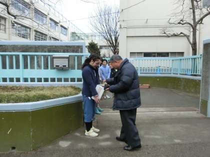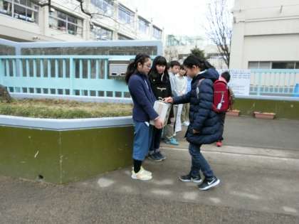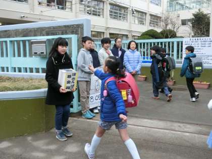 今朝も正門で、6年生の代表委員会のみなさんが、ユニセフ募金活動に取り組みました。毎日の呼びかけに応じて、今日もたくさんの友達が募金をしていました。また、学校運営委員会委員の町会長さんも、子どもたちの活動に協力してくださいました。