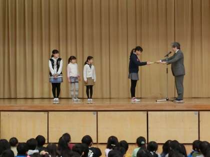 次に、読書感想文が特選・入選・佳作に選ばれた子どもたちの表彰を行いました。最後は6年生による笹の子スピーチです。今日は、「オリンピック・パラリンピックについて」と「宿題について」のスピーチでした。身近な話題について、調べたことや考えたことに自分の思いも入れてよくまとめられていました。