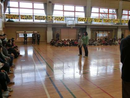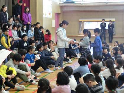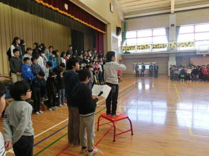 代表委員会の子どもたちによる始めの言葉の後、「グッデーグッバイ」を全員で歌いました。その後、赤・青それぞれの班ごとに、6年生にカードを渡しました。