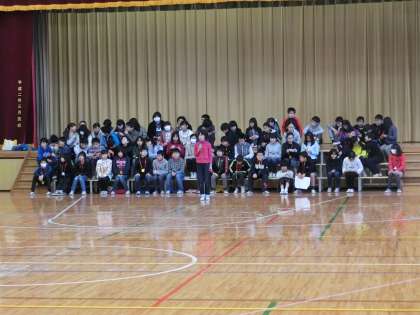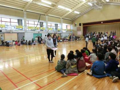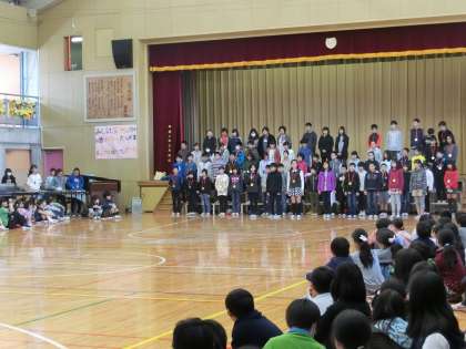 最後の出し物は6年生。自分たちで選曲した歌と演奏です。とてもきれいな歌声と美しい演奏に会場からはアンコールの声がかかりました。各学年の子どもたちに向けたメッセージも、とてもすばらしかったです。その後、6年生から各学級の代表の子どもへ送りものが手渡されました。