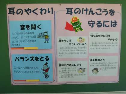 保健室の掲示コーナーには、耳の役割や大切さについて伝える資料が掲示されています。休み時間には、子どもたちが眺めたりページをめくったりしながら、活用している姿が見られます。