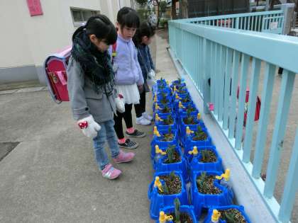 どんな色の花が咲くのか楽しみにしている子どもたちです。
