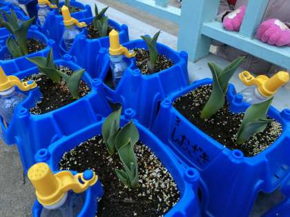 登校し毎日観察をしている子どもたちから、「こんなに大きくなってきたよ!」と嬉しそうな笑顔で報告がありました。つい先日まで、わずかに地表に芽を出していたチューリップですが、地表から葉が伸び、チューリップと分かる姿を現し始めています。