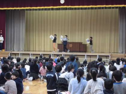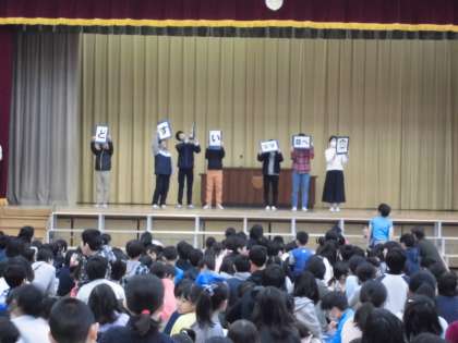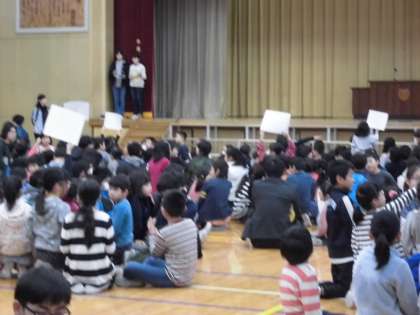 今日の児童集会は「どすこい 文字並べ集会」でした。集会委員が文字カードを持ってくるくる回ったり、文字を逆さにしたり裏返したりしながらステージを通ります。その文字をよく見て並べ替えてできる言葉を当てるゲームです。笹の子班で取り組み、指定された学年の子が答えます。「どすこい」でお分かりのように、今日は相撲に関する言葉が全部で6問出題されました。「笹の子班で楽しく文字並べをしよう」のねらいどおり、どの班も楽しそうに取り組んでいました。