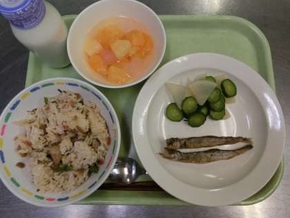 フルーツ寒天は3種類のフルーツを寒天で固めて作っています。みなさんは寒天とゼラチンの違いを知っていますか?どちらもゼリーなどのようにジュースや牛乳などを固めるために使われます。ゼラチンは動物の骨などに含まれるコラーゲンから作られるのに対して、寒天は海藻から作られます。ゼラチンで固めた方がプルンとやわらかい食感になり、寒天で固めると硬めのしっかりとした食感になります。作るときにも、加熱温度や冷やす温度に違いがあります。