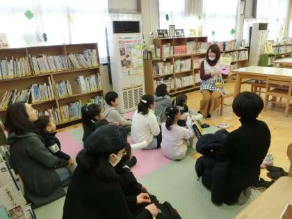 ミニお話会では、「まめうしくんの ももいろのはる」の読み聞かせがあり、今の季節にぴったりの心温まるお話に、子どもたちは聴き入っていました。